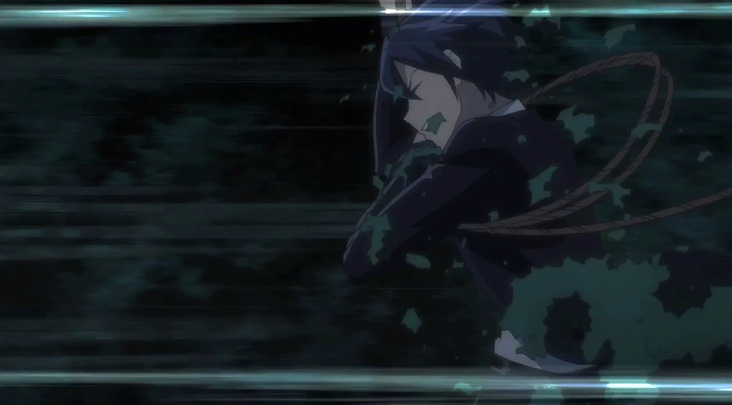 Suddenly, a loud explosion is heard. Rentaro insults the person's intelligence as the explosion has awaken the forest. True to his statement, a Gastrea stands behind them. Rentaro, asking Enju if she could carry him, tells her to run. Running away from the Gastrea, Rentaro tells Enju that he is counting on her, which causes her to jump high in the trees. However the Gastrea proves to be speedy. Nevertheless, Enju jumps on its head and with the accumulated momentum jumps high near a cliff, and from the cliff she then jumps yet again. As they "fly", Rentaro sees "Ladder of Heaven." Once they land, they continue to search the area, until Enju has a gun pointed at her head.[49]